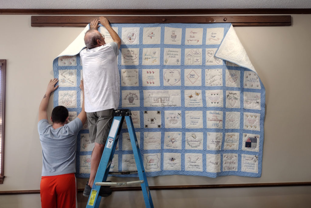 Larry Holland and Ashton Bay work together to hang one of the memorial quilts.