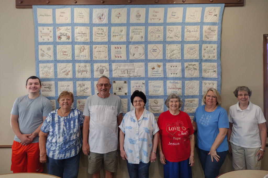 CAPTION: Pictured from left to right are Ashton Bay, Betty Holland, Larry Holland, Elda Prouty, Nita Reed, Carroll Stanojevich, and Rita Cannon in front of one of two Memorial Quilts that were recently rehung at the Dresden Senior Center.