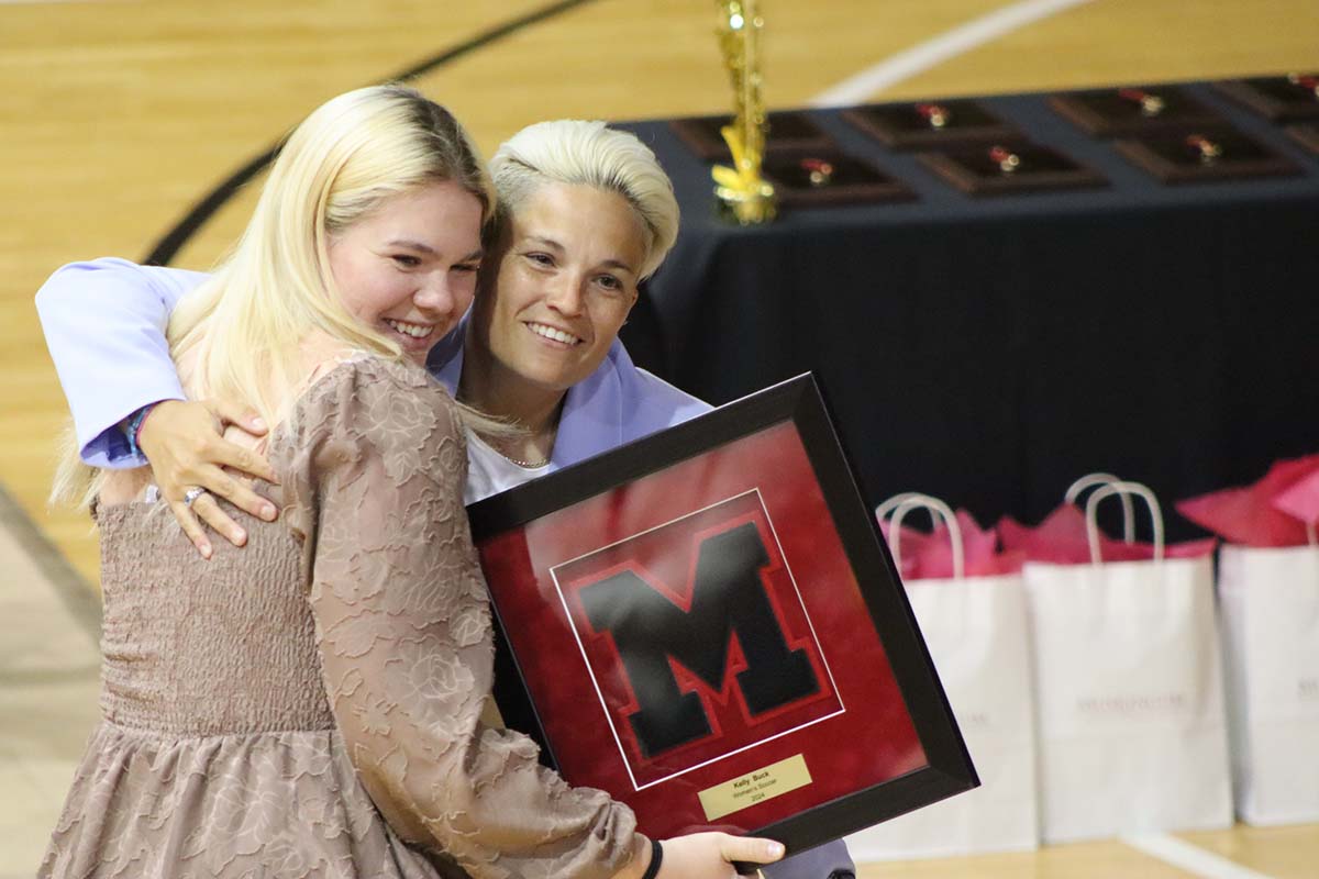 Caption: Kelly Buck hugs head women’s soccer coach Dani Gunderson. Credit – @FightingMuskies