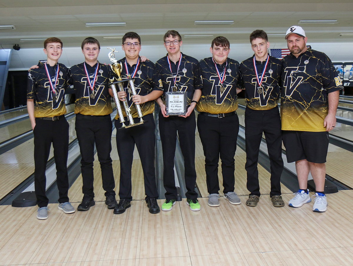 Tri-Valley boys varsity bowling team with their MVL League trophy. Coach Ben Kight also received MVL Coach of the Year.