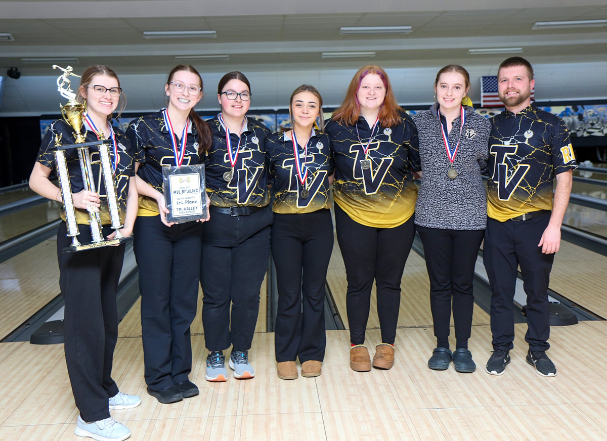 Tri-Valley lady bowlers holding their MVL League trophy. Coach Zack Forker was named the MVL Girls Coach of the Year.