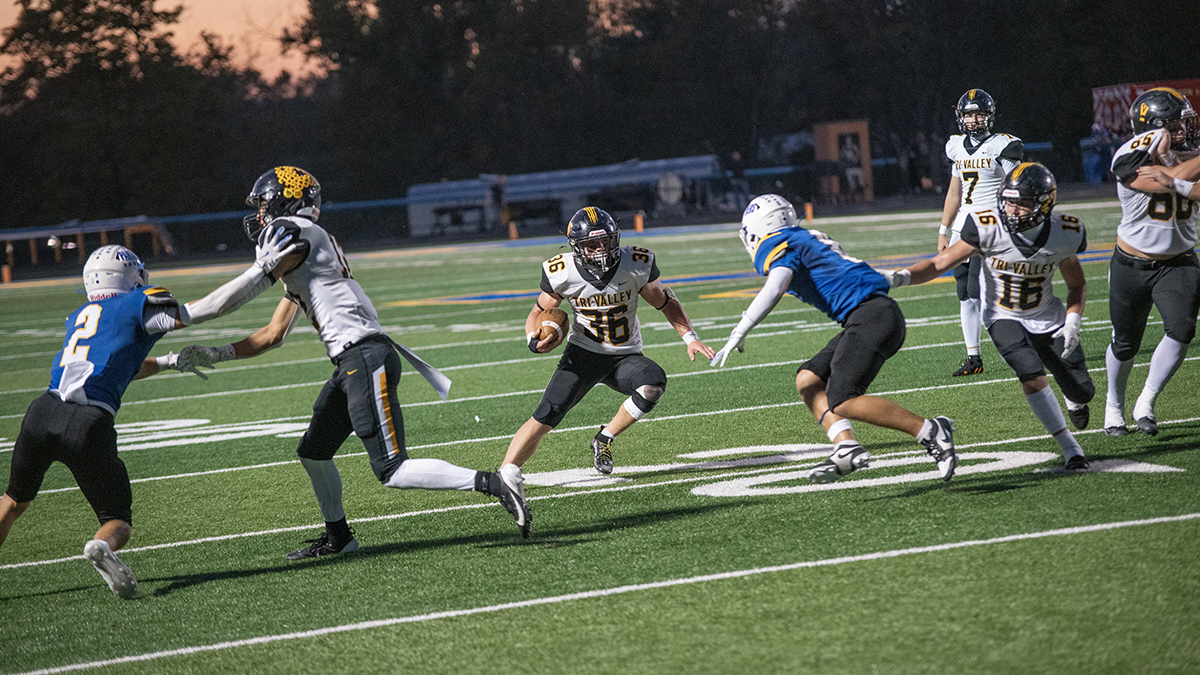 The Friday night lights were shining brightly in Maysville on Friday for the Tri-Valley Scotties. Right after the kickoff, the Dawgs were pushing ahead and jumping out to a 14 – 0 lead by the end of the first quarter. Maysville pulled out a touchdown early in the second quarter, dropping the deficit to 14 – 7. With seven minutes to go in the half, Tri-Valley made another rushing touchdown with a two-point conversion to lead 22 – 7. Maysville answered back with another touchdown to only trail by 22 – 14. With just two minutes left in the second quarter, Tri-Valley nabbed one last touchdown, but so did the Panthers, and the two teams went to halftime with the score Tri-Valley 29 – Maysville 21.